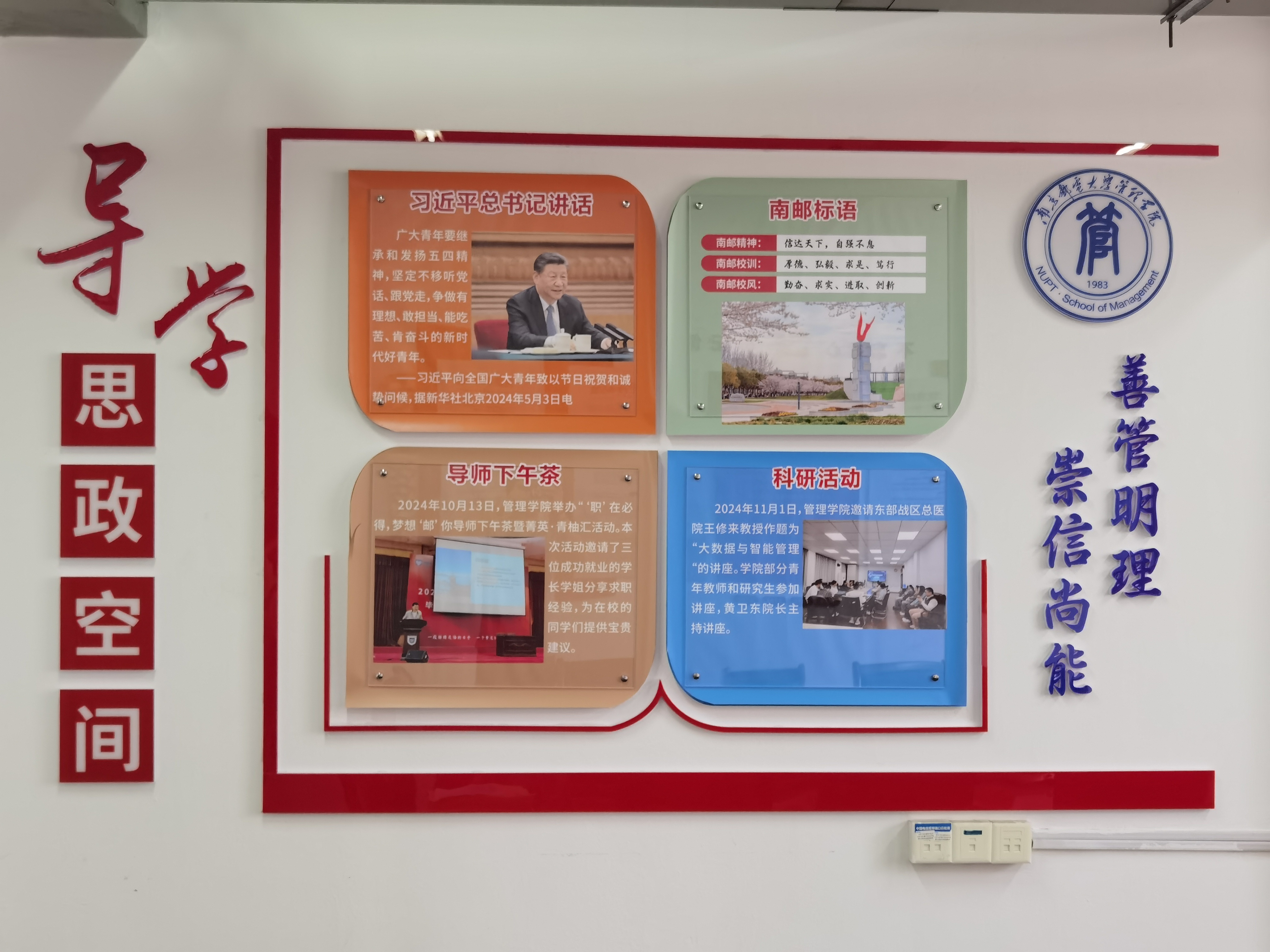 空间内分区设计,分区放置习近平总书记给青年的嘱托、南邮标语、导师下午茶、科研活动等模块,且各版块采用可替换设计,可不断更新活动内容;同时设置照片墙,展示新葡的京集团35222vip思政活动、志愿活动、学术活动、心理活动等丰富的活动照片。