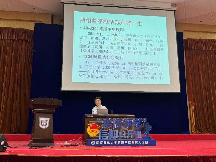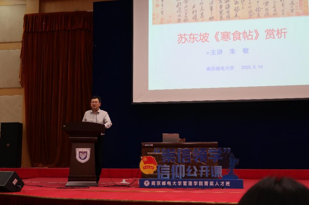 讲座伊始,朱敏主席以《天下第三行书——苏东坡<寒食帖>赏析》为题,围绕苏东坡黄州谪居、抽绎掌故等内容,用两组数字启迪同学们走近这位“世界名人、千年英雄”,巧妙地呈现了《寒食帖》背景,启迪同学们突破传统“诗酒东坡”的解读视角,以书法艺术为切口解码“世界千年英雄”的精神密码,为传承发展中华优秀传统文化提供方法论启示。