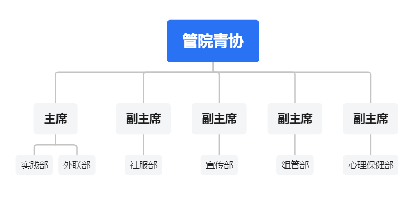 其中,管院青协设主席一人,负责各部门协调与各类活动的组织安排,还负责实践部与外联部指导工作;副主席四人,管理社团内人员与规章制度以及财务报账工作,分管组管部、宣传部、社服部、心理保健部事宜。
